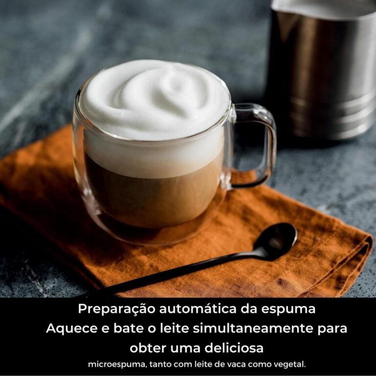 O Dual Froth System é o sistema automático de espuma que funciona tanto com leite comum quanto com leites vegetais, sem esforço. A máquina aquece e espuma o leite ao mesmo tempo, criando uma microespuma macia e aveludada, perfeita para cappuccino, latte ou flat white. Não precisa de acessórios nem conhecimento técnico: é só escolher o tipo de espuma e a máquina faz tudo sozinha.