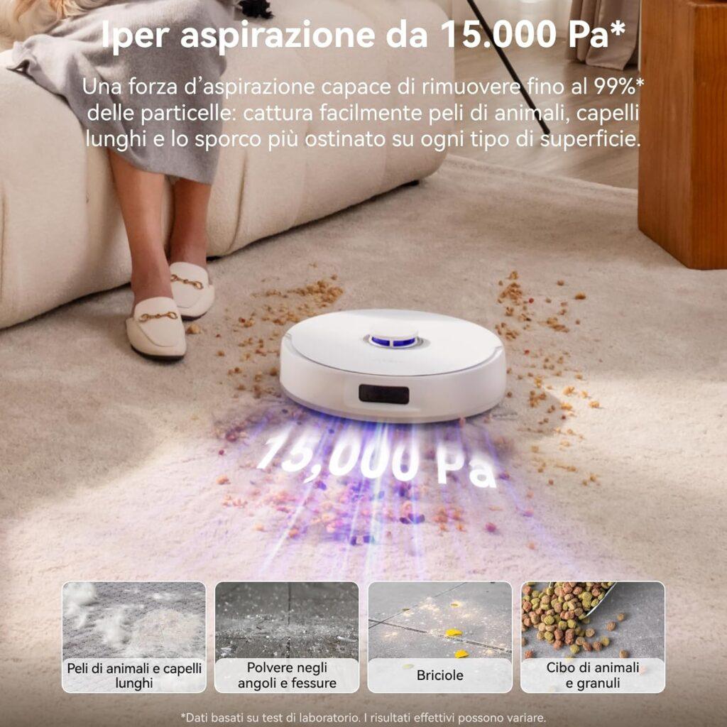 Questo Robot è dotato della più recente tecnologia 4-in-1 con un motore più potente che aspira, lava, asciuga e disinfetta l’intera casa in modo completamente indipendente e impeccabile!